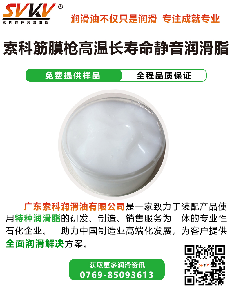 索科SVKV筋膜槍高溫長壽命靜音潤滑脂選用高性能基礎油,并添加多種高效抗氧化、抗腐蝕等添加劑精制而成,是專為筋膜槍零部件研發的潤滑油脂。索科SVKV筋膜槍高溫長壽命靜音潤滑脂能有效減少筋膜槍軸承套筒磨損,降低噪音,以達到延長壽命的效果。