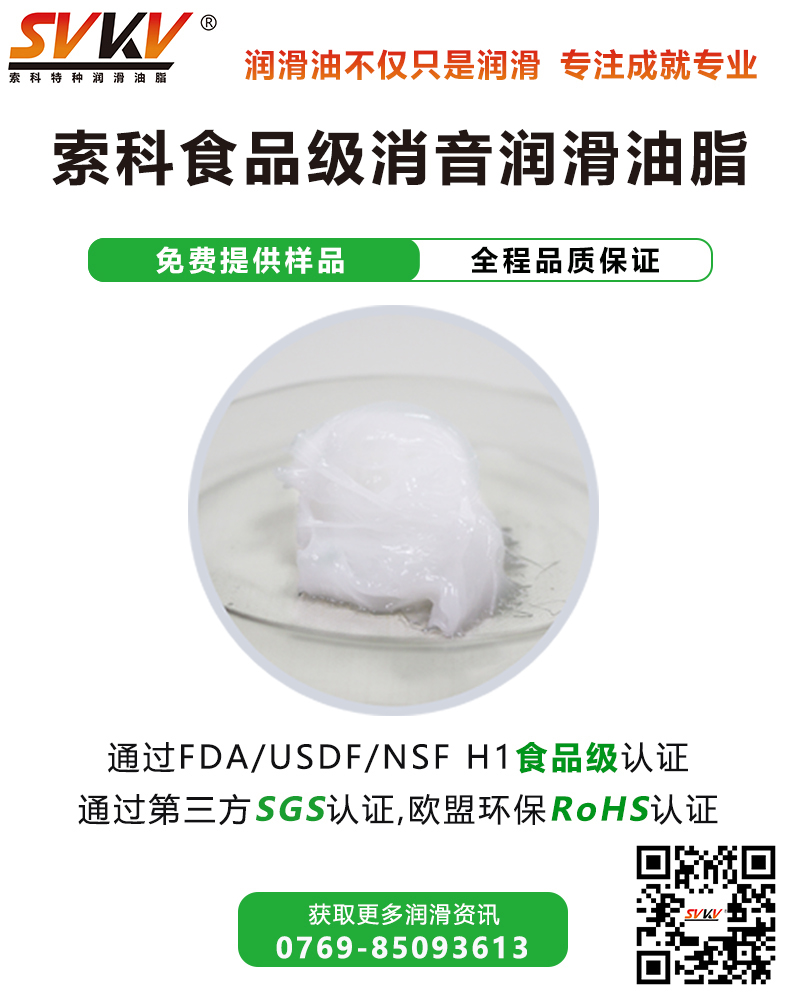索科SVKV食品級消音潤滑脂符合美國FDA和USDA的法規標準,并通過美國USDA/NSF H-1食品級認證,保障食品安全。