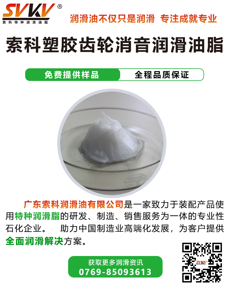 索科SVKV塑膠齒輪消音潤滑油脂具有優異的消音、潤滑、抗磨損及耐久性能,由中粘度復合油為基礎油,鋰皂為稠化劑并加多種添加劑精制而成的塑膠用潤滑脂。此塑膠相容性潤滑脂專為電子、電器、玩具、儀器等行業的塑膠齒輪、塑膠零件的潤滑、降噪音而設計,并符合美國ASTM963—96a、歐盟ROHS環保要求。