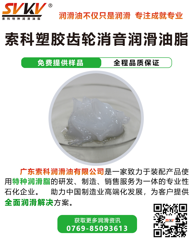 廣東索科潤滑油有限公司是一家致力于裝配產品使用特種潤滑脂的研發、生產、定制、服務為一體的專業性石化企業。致力為制造業客戶,提供專業的選油方案,協助客戶解決產品裝配時的潤滑難題,還可根據客戶特殊需求訂做適合的潤滑油品。有效提高產品性能、減低維護成本,索科助力制造業高端化發展! 主要產品有: 齒輪消音潤滑脂|高溫潤滑脂|食品級潤滑脂|齒輪消音潤滑脂|防水潤滑脂 導電油脂|軸承油|硅油|干性皮膜潤滑劑|低溫潤滑脂|阻尼脂|全氟油脂